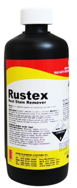 RUSTEX is a chemical treatment for removing rust and blood stains from carpets, some fabrics, windows, stainless steel and vinyl floors