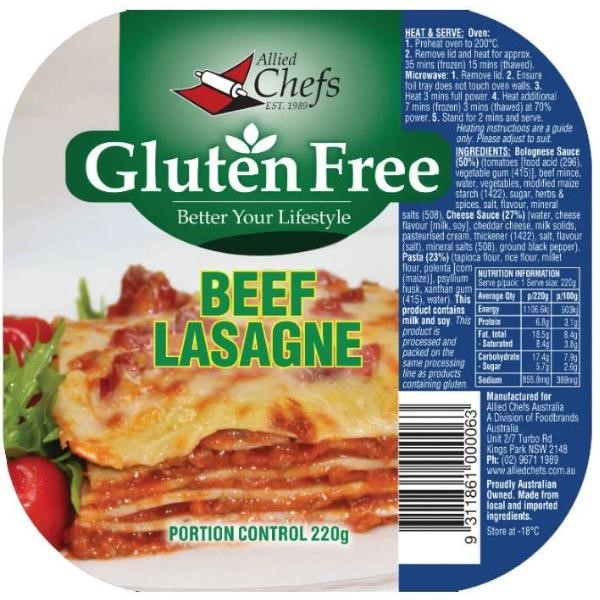 Authentic recipe of specially selected beef, tomatoes, fresh vegetables, herbs and spices, specially blended to form a superlative sauce, which together with a rich creamy bechamel sauce is layered between sheets of Allied Chefs' specially prepared pasta and topped with our special cheese blend