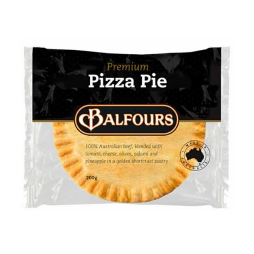 Balfours premium pizza pie, made with 100% Australian beef, blended with tomato, cheese, olives, salami and pineapple, encased in a golden short cut pastry