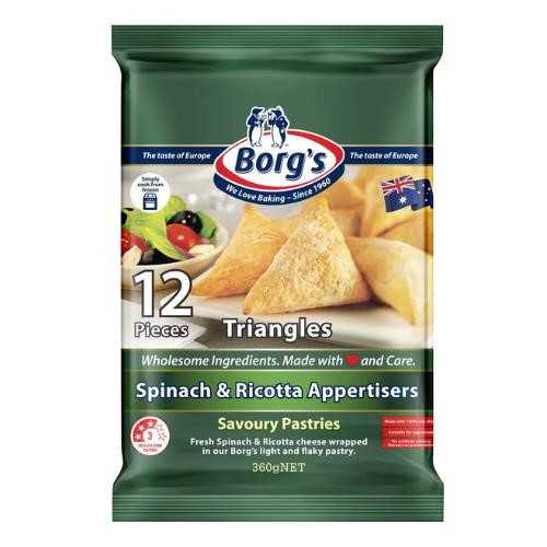 Borg's Spinach & Ricotta Triangles, fresh Spinach & Ricotta wrapped in our Borg's light and flaky pastry