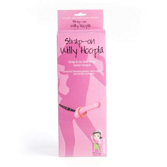 Strap on this huge pink willy and get ready to play the naughtiest game of hoopla Your friends take turns to land the rings onto your huge willy Create the naughtiest rewards/punishments Includes a 9 inch strap-on willy and 6 assorted colour rings Add some cheeky fun to your Hens Night with the Strap-On Willy Hoopla Game