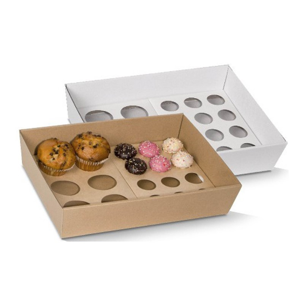 Cupcake insert with 12 holes, multi-colored-brown kraft color on one side, and a clean white on the other to fit both brown kraft and white trays
