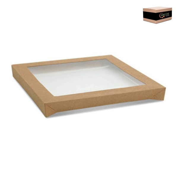Large Square Kraft Catering Tray Lid, Made from all-natural paper cardboard material, with a centred transparent PET sleeve to allow you to showcase your foods – making the lid recyclable, Effective and efficient – flat packed for better storage and no assembly required