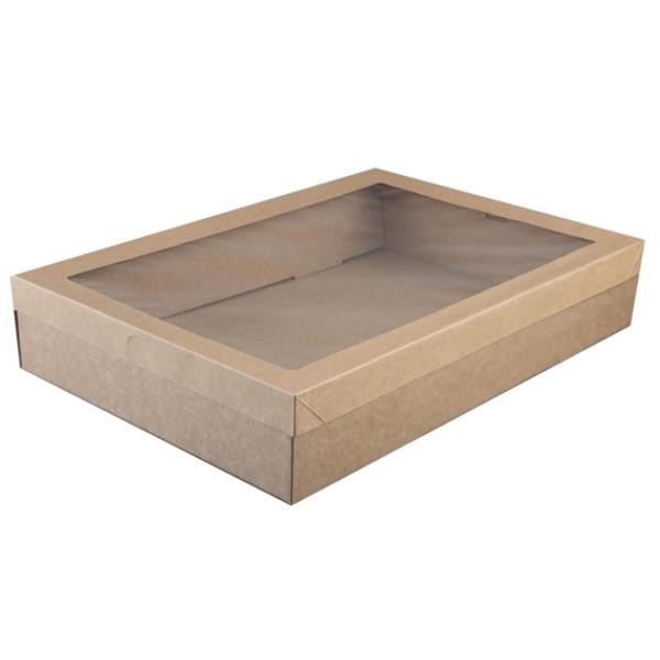 Made from brown kraft paper with a clear plastic window, these catering boxes are not only environmentally friendly but also stylish and sleek looking