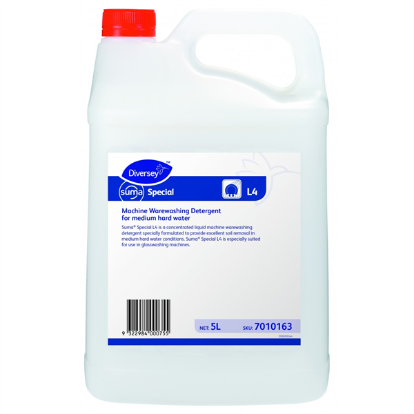 Suma Special L4 is a concentrated liquid mechanical ware washing detergent specially formulated to provide excellent soil removal in soft to medium hard water conditions
