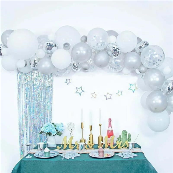 Silver Balloon Garland set includes; 15 * 5" White latex balloons 15 * 5" Pearl silver latex balloons 10 * 12" White latex balloons 10 * 12" Pearl Silver latex balloons 8 * 12" Silver confetti balloons (prepacked) 2 * 18" White latex balloons 10 * 10" Round SIlver foil balloons The set will make estimate 4 meters and comes completed with 40 glue dots OTHER DISPLAYED ITEMS IN THE PICTURE ARE NOT INCLUDED