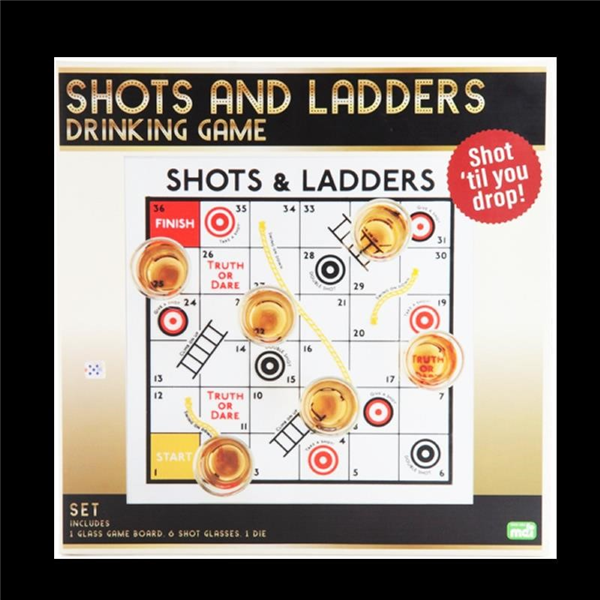 Turn one of the world's most beloved board games into a drinking game diversion! The game is played just like the original, but instead of 'chutes' there's shooters! Follow the game instruction provided, add your favourite drink to the glasses, play and drink up! •Perfect for 2-6 people •Set crafted from glass •Comes with instructions, 6 shot glasses, one dice, and a 33cm x 33cm board