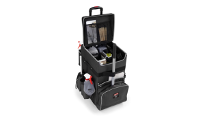 Features include a heavy-duty kick plate, large front pocket, secure strap for stick tools, and adjustable dividers to organise a wide range of supplies