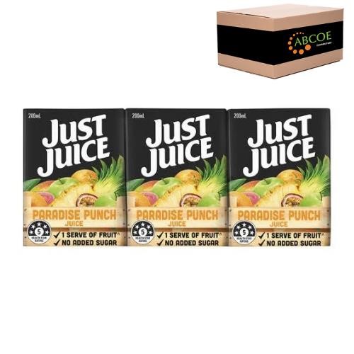 Just Juice Paradise Punch flavour is 99.9% fruit juice that has no added preservatives and is high in vitamin C, perfect for packed lunches, homes, picnics, BBQs, offices and more