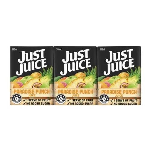 Just Juice Paradise Punch flavour is 99.9% fruit juice that has no added preservatives and is high in vitamin C, perfect for packed lunches, homes, picnics, BBQs, offices and more