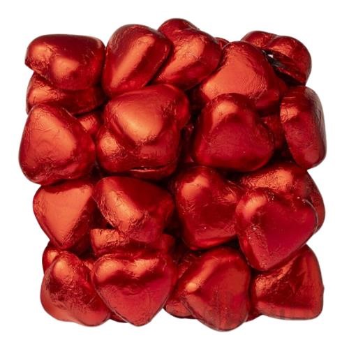 Red foil wrapped, heart shaped milk chocolate