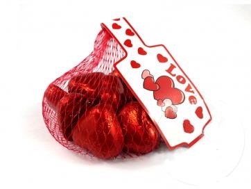 Red foil wrapped, heart shaped milk chocolate in a mesh net