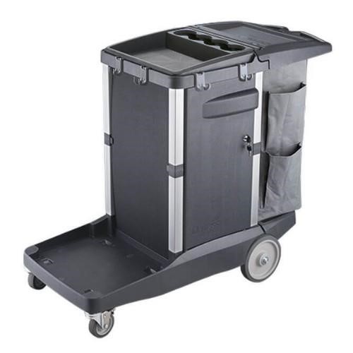 This cart includes full doors on the medium and lower compartments for secure chemical and supply storage, a laundry zip bag with a lid to conceal waste, hook clips for lobby pans and signs, and an Ergo bucket footprint for stable placement