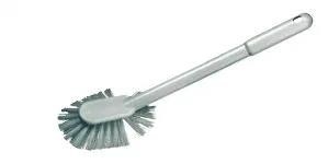 is designed with a stiff, durable bristle head and an angled radial shape to easily clean hard-to-reach areas of the toilet bowl