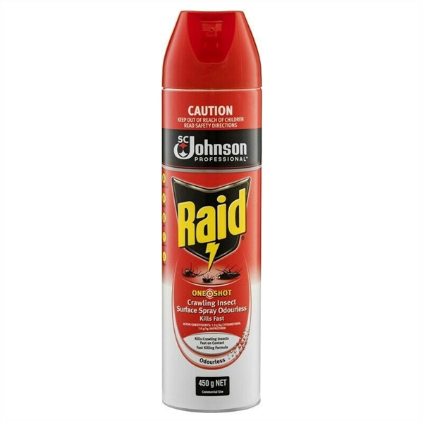 Raid One Shot Crawling Insect Surface Spray Odourless Kills Fast kills in two ways - Kills crawling insects fast on contact and keeps on killing crawling insects for up to 4 weeks to provide long term protection.