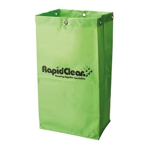 is a durable, high-visibility green bag designed to replace the standard bag on the blue janitors cart, offering a convenient and hygienic solution for collecting rubbish or transporting linen
