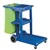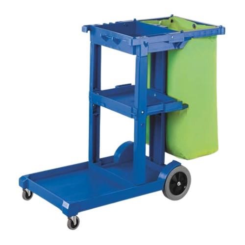 Featuring a sturdy frame with ample hanging space for accessories, it includes a blue cart and green bag to support efficient waste and supply management
