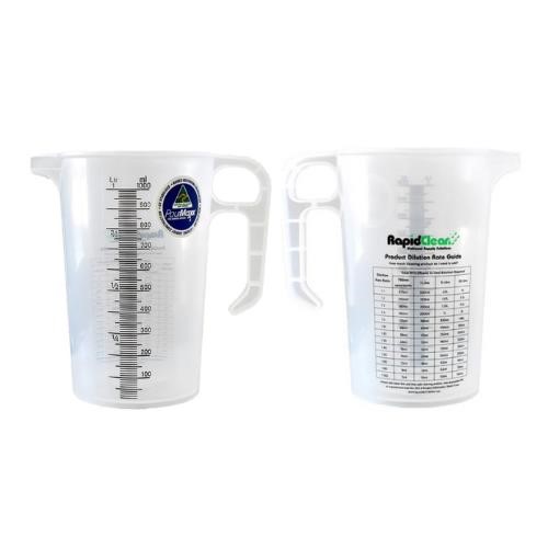 Rapid Clean Pourmaxx Measuring Jug has graduated markings in litre (showing 1/4, 1/2, 3/4 and 1 litre) and millilitres (displaying 100ml increments, and markings every 10ml)