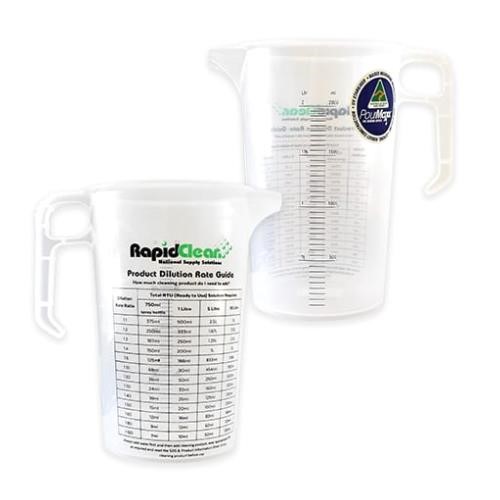 Rapid Clean Pourmaxx Measuring Jug has graduated markings in litre (showing 1/4, 1/2, 3/4 and 1 litre) and millilitres (displaying 100ml increments, and markings every 10ml)