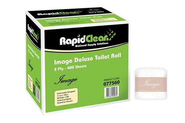 RapidClean Image Deluxe Toilet Tissue Roll 400s are individually wrapped deluxe toilet rolls which deliver premium quality and softness in the form of a conventional toilet roll