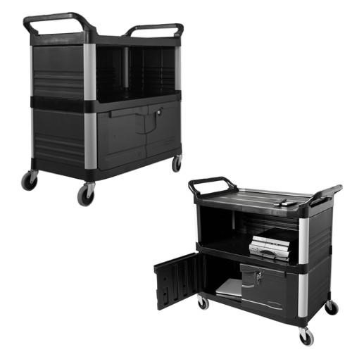 Rubbermaid XTRA Equipment Service Cart is a 3 Shelf trolley enclosed on 3 sides and fitted with lockable bottom doors that protect equipment and goods