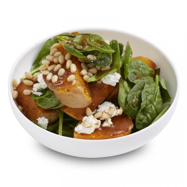 Delicious roasted butternut pumpkin, with feta cheese, baby spinach & pinenuts with a balsamic dressing