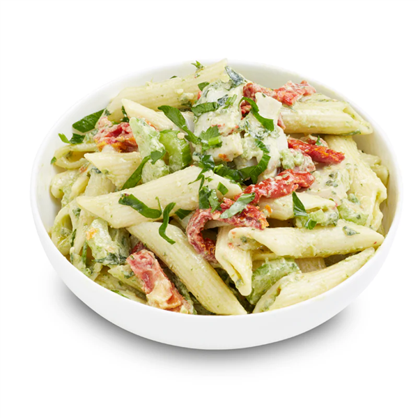 Penne pasta, chicken, celery, sun dried tomatoes, parsley in a creamy basil mayonnaise