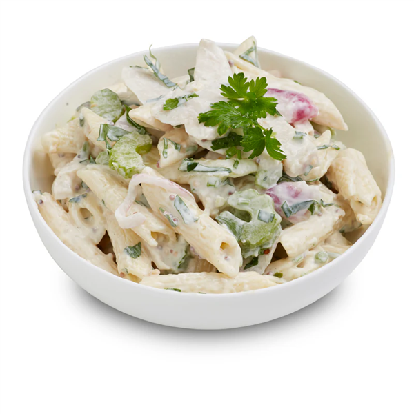 Penne pasta, chicken, fresh vegetables & herbs in a creamy grain mustard mayonnaise