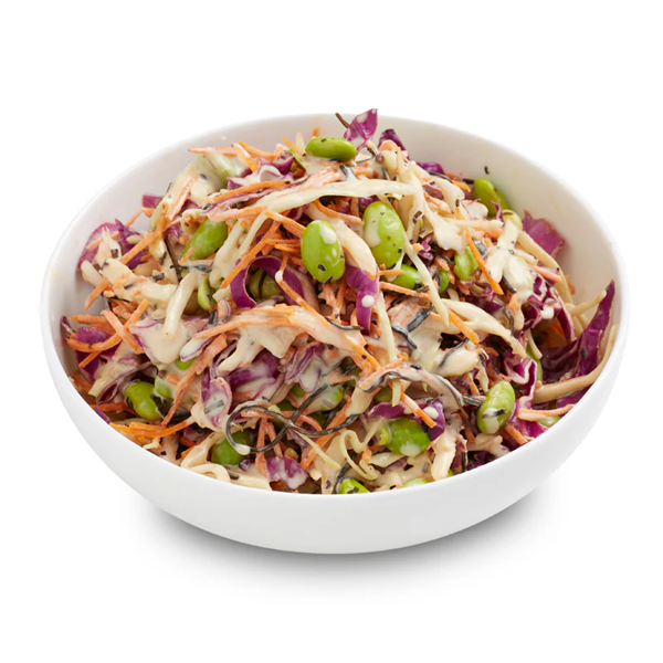 A crunchy dry mix of red and white cabbage, julienne carrot, soy beans and arami seaweed with a Roast Sesame and Miso Dressing