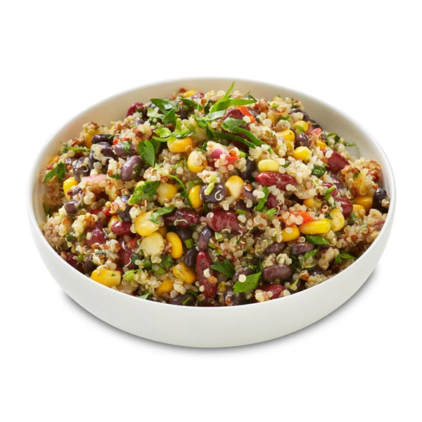 A ready to serve salad consisting of quinoa, corn and red kidney beans in a salsa dressing