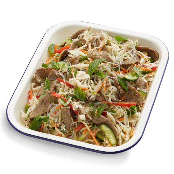 Vermicelli noodles with marinated thai beef, crisp vegetables, fresh aromatic herbs & sesame seeds in a Thai lime dressing