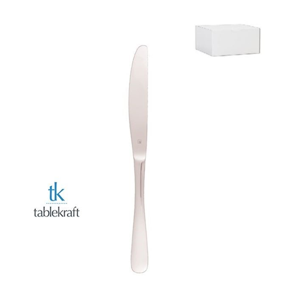 Bring an elegant flair to your dining table with the Tablekraft Luxor Table Knife.æ Made from sturdy 18/0 stainless steel, these table knives feature gentle, rounded edges and are easily stacked for storage