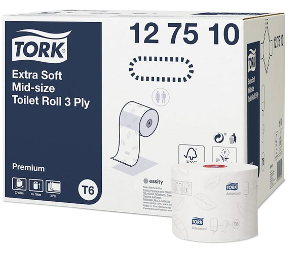 The Premium Tork Extra Soft Mid-size Toilet Roll offers a superior look and feel with the right performance.